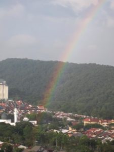 雨上がりの午後、なにげなく外を見たら、近くのモスクから綺麗な虹が!