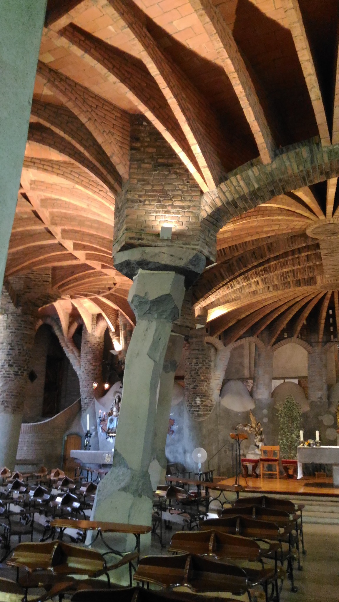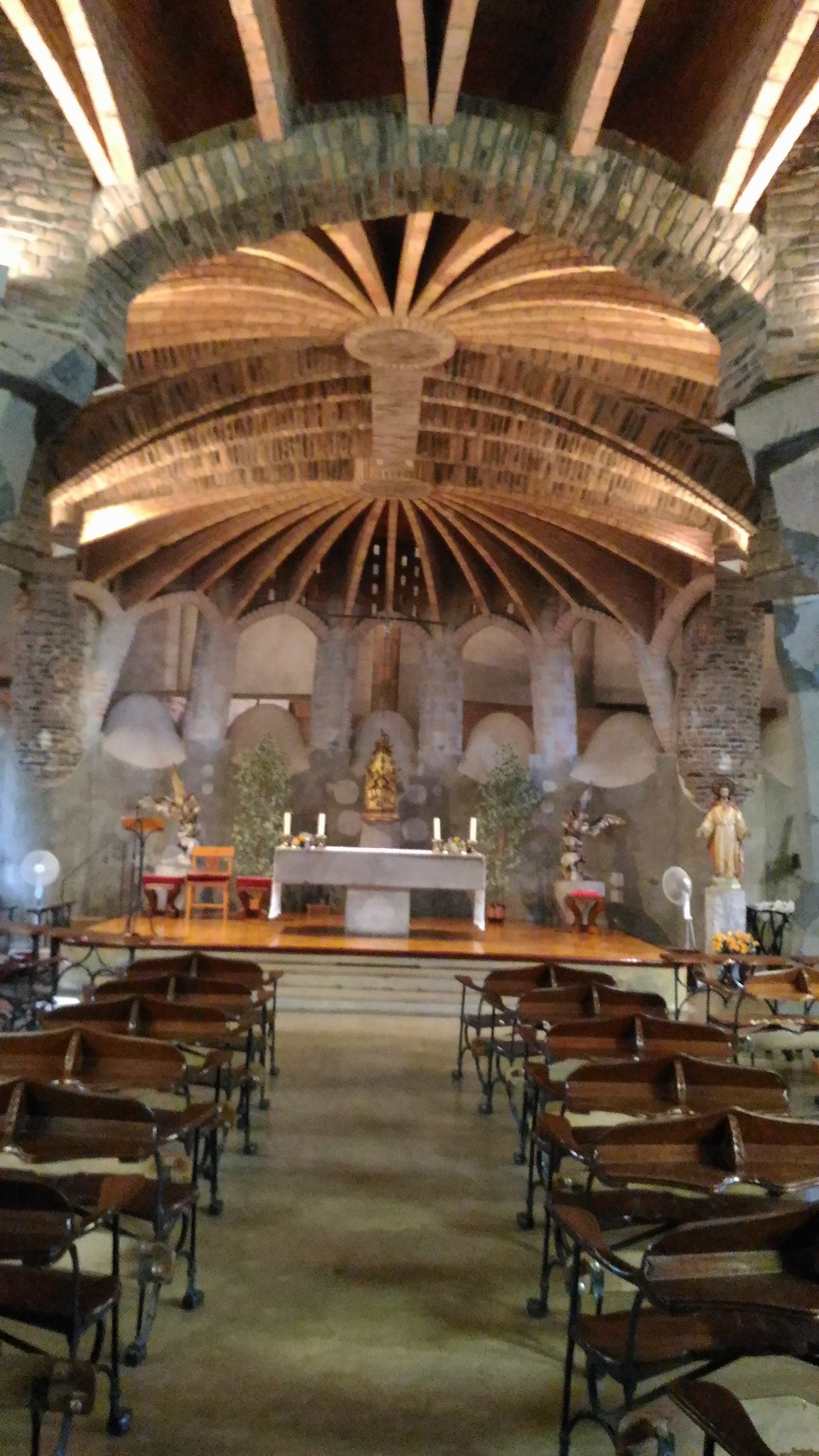 ガウディのパトロンだったグエルの依頼で世界初の工業コロニー内に教会を作ろうとしましたが、有名な逆さ吊り設計に10年間もの時間をかけながら途中で手を引き、サグラダファミリアに専念します。