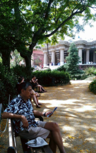 2ヵ月の間に雨が降ったのは2日だけ!よく給水制限にならないものだと妙なところで感心している。ここバルセロナはスペインの避暑地になっていて、内陸部が40度超えの日でも29度ほどで比較的涼しい。それでも公園では犬たちが水浴びして喜んでいる。