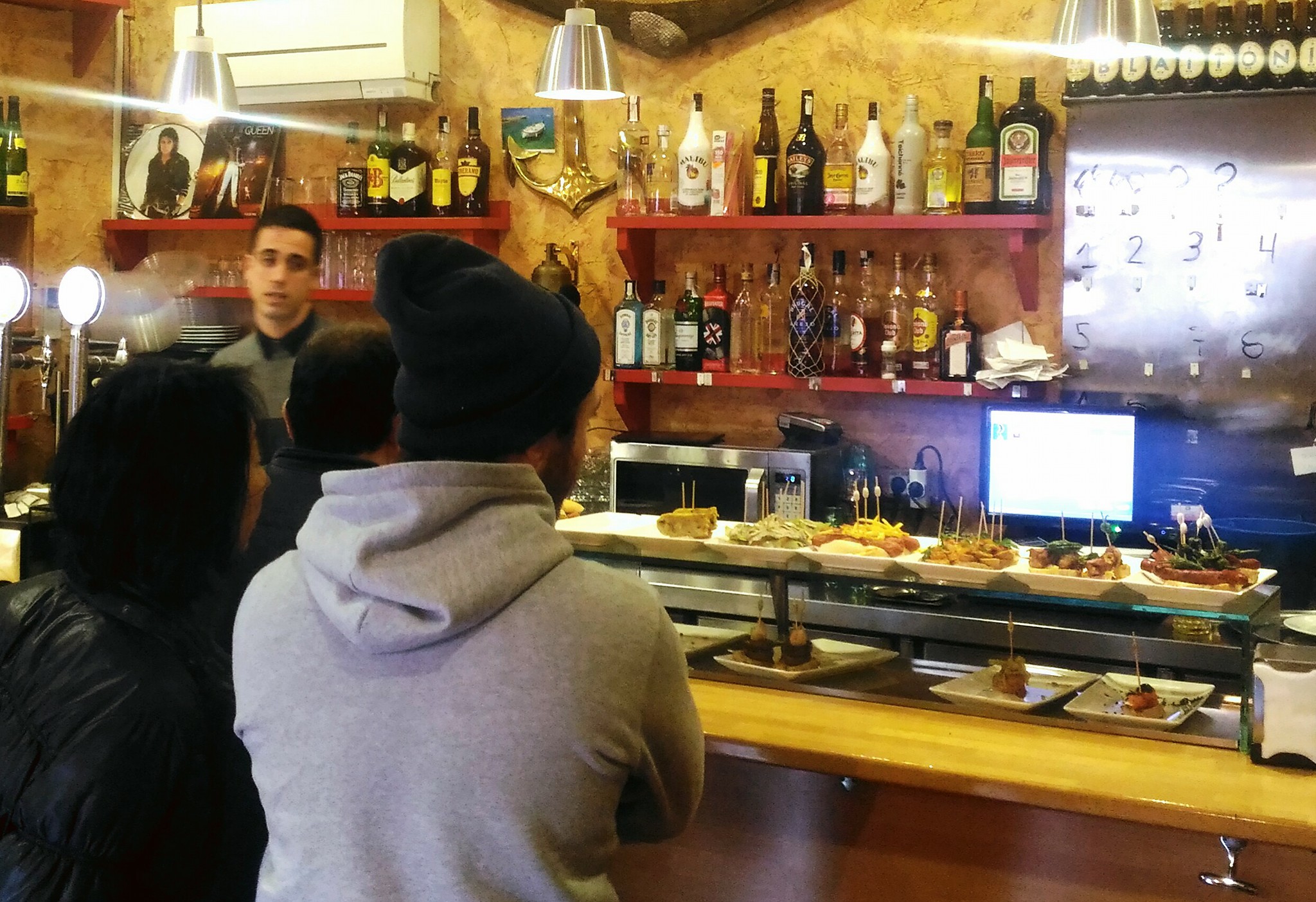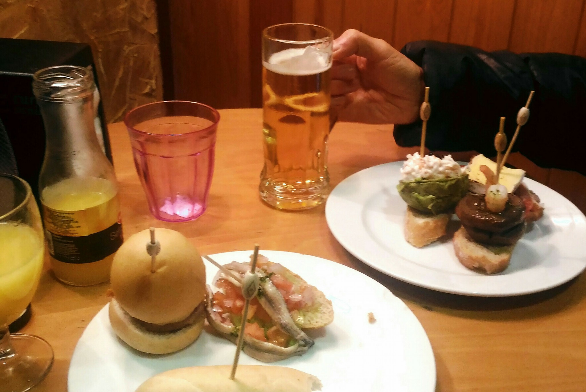 今日は、お昼2時間を日本語とスペイン語の交流会で過ごし、その後近くのタパス通りの老舗で昼食を取りました。1皿1€と1.5€の2種類の色んなタパス(小皿料理)を自分で選び、帰りに串の数で精算するという面白い料理屋でした。